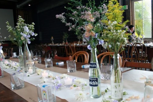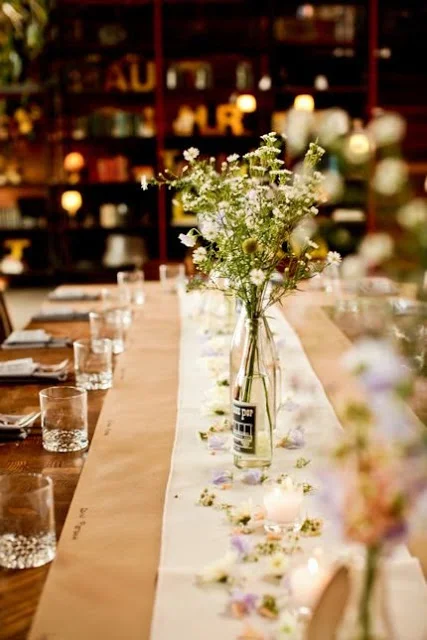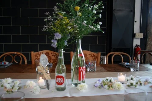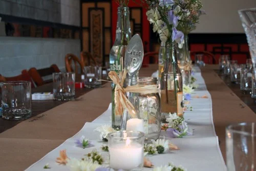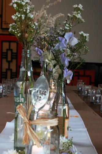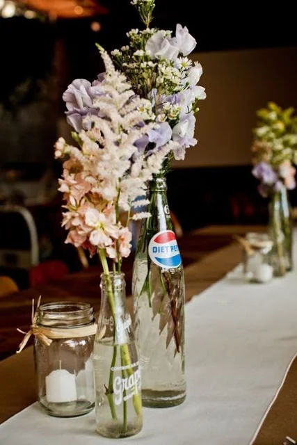 Senta picked out these awesome old soda bottles from the Rose Bowl Flea Market to use as her centerpiece containers. It was really cool seeing all the different brands of soda pop from back in the day! We sprinkled loose flower blossoms along the length of each reception table.