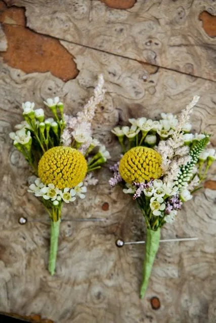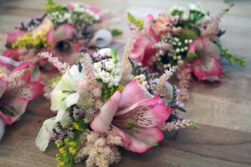 Boutonnieres featuring yellow craspedia, waxflower, astilbe, veronica, and limonium. Lovely wildflower bouquet of limonium, stock, waxflower, alstroemeria, astilbe, veronica, and monte casino aster.