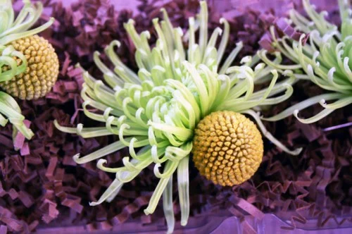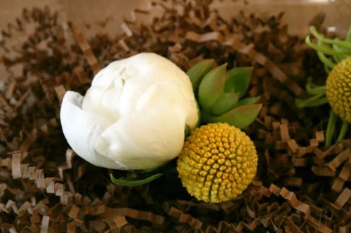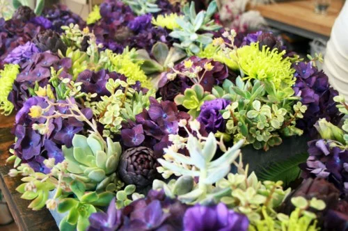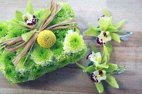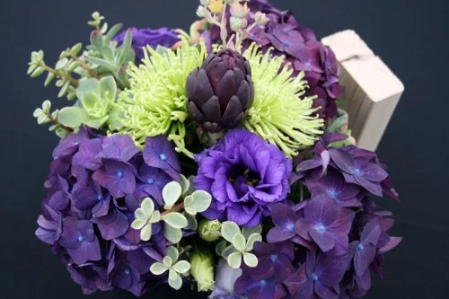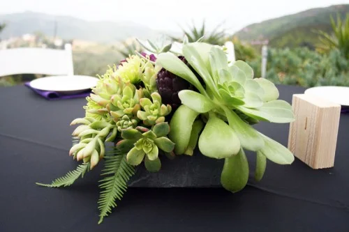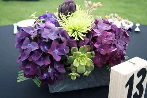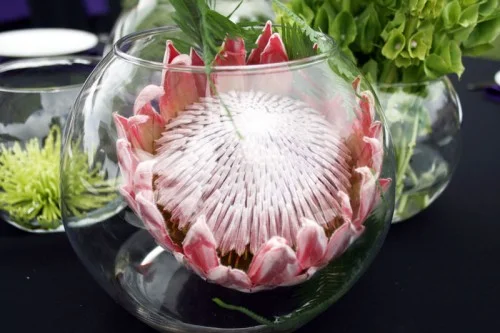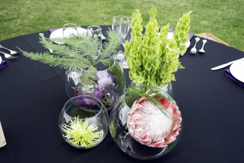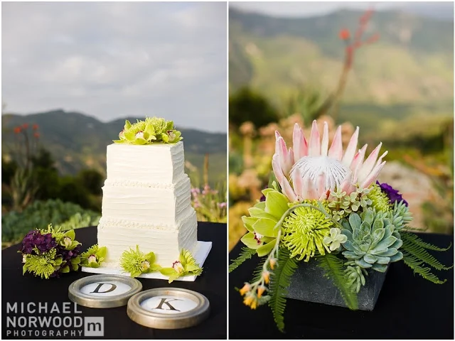.Tall white arrangements of hydrangea, dendrobium orchid and delphininm were placed on pedestals framing the bride and groom.